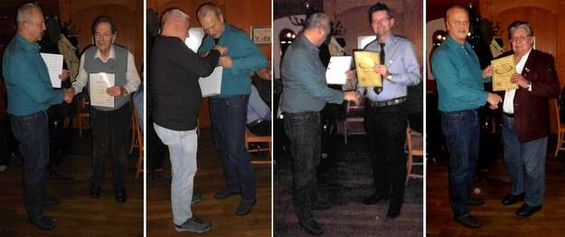 Eines hat sich erhalten, der Dank an die Mitglieder, die uns lange Jahre treu geblieben sind. Aber wenn nun der 2. Vorsitzende tätig werden muss, weil auch der 1. Vorsitzende zu ehren ist, dann geht das nicht ohne einigen Spaß ab, werden doch Nadeln überreicht, die man auch zu etwas Schabernack verwenden kann. Vor allem, wenn es dem Einen an der Übung fehlt. Beide haben es überlebt.